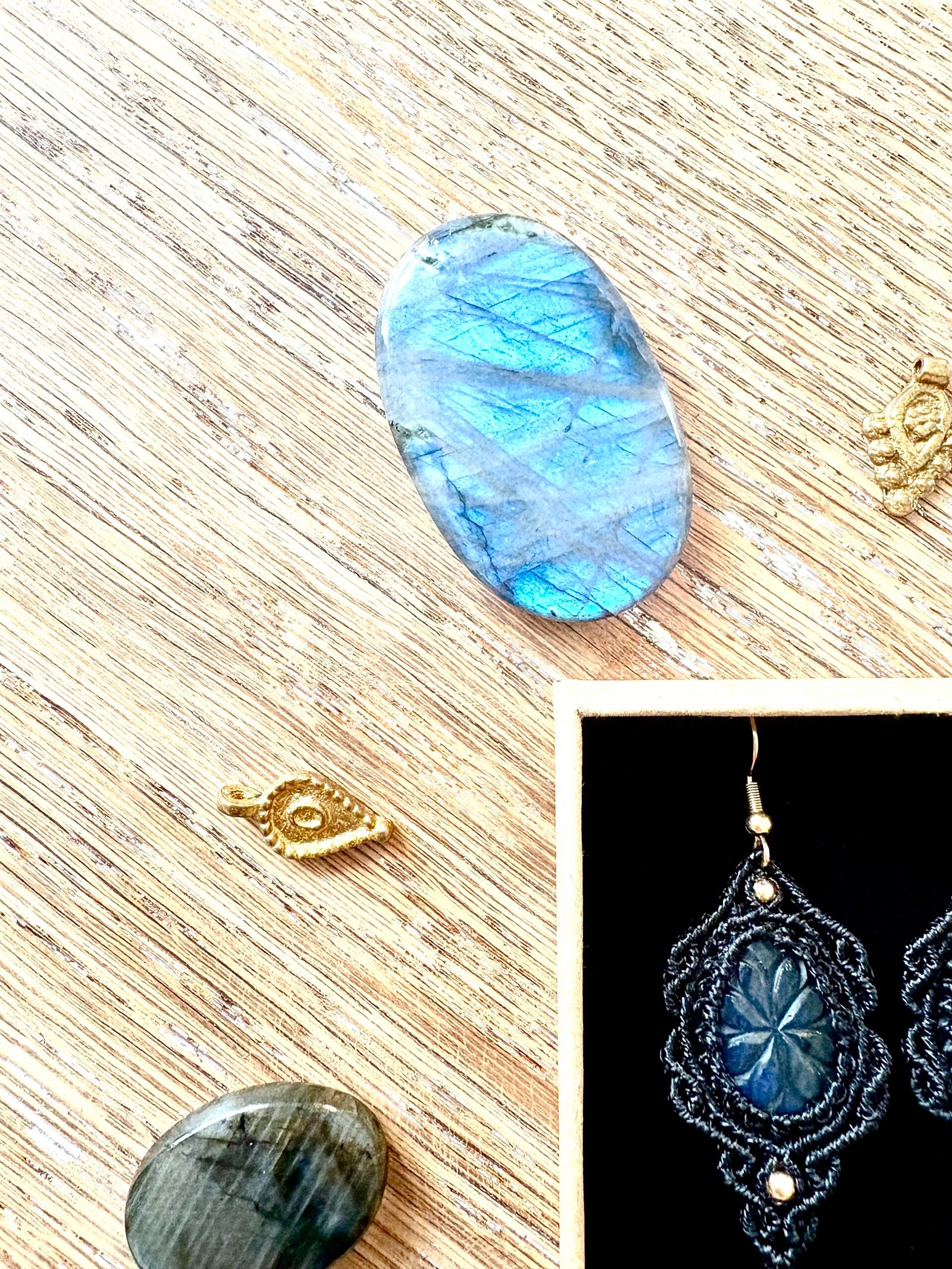 Ornées de somptueuses labradorites ciselées de motifs fleurs, en forme de goutte, ces boucles d’oreilles sont soigneusement réalisées à la main, alliant l’art du micro macramé à la beauté naturelle de la labradorite, connue pour son rôle de bouclier contre les énergies négatives.