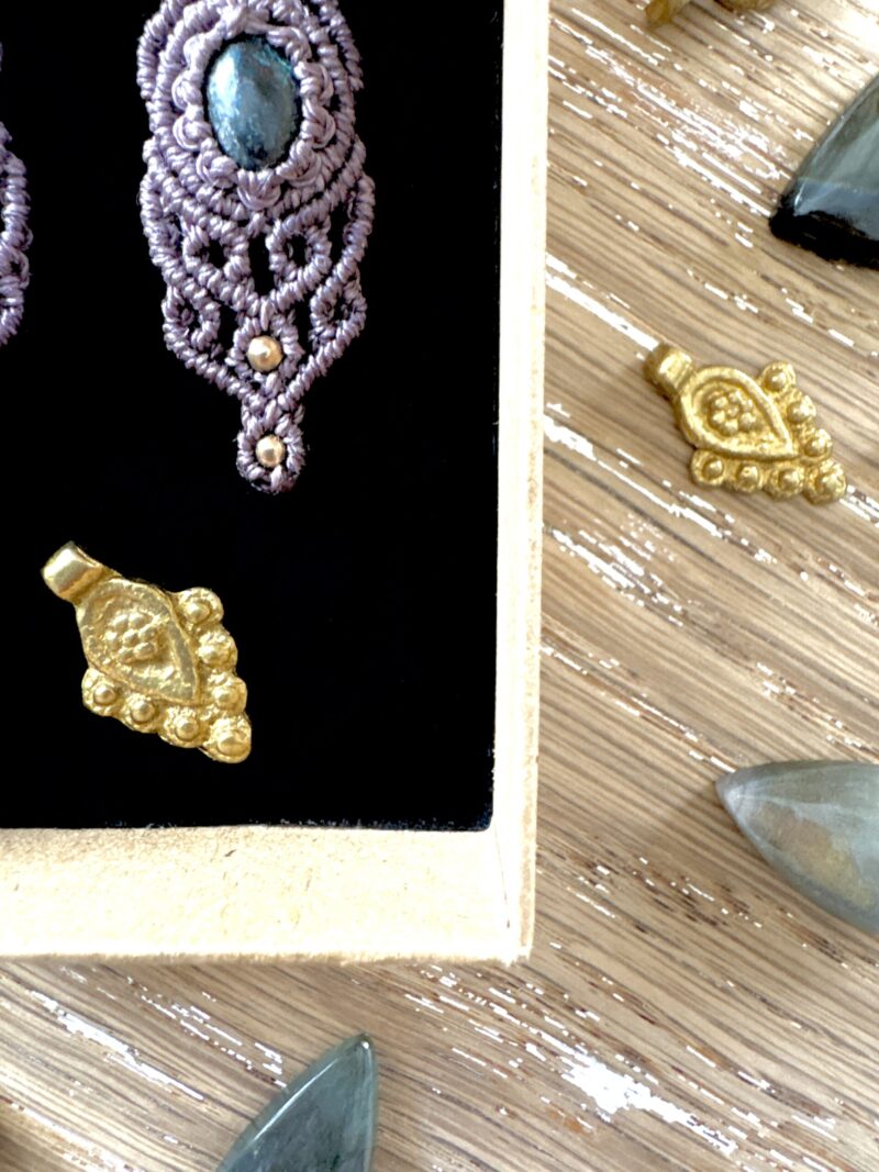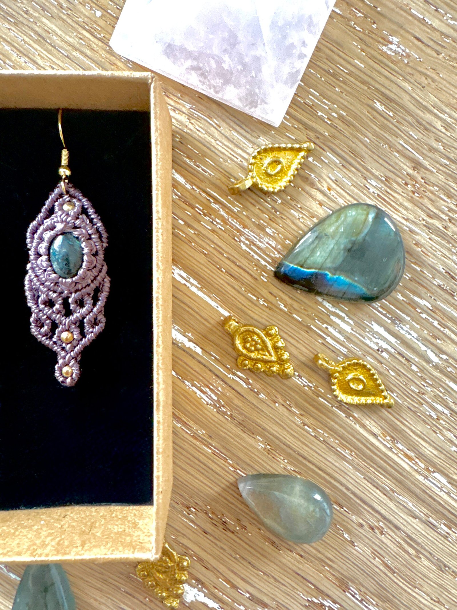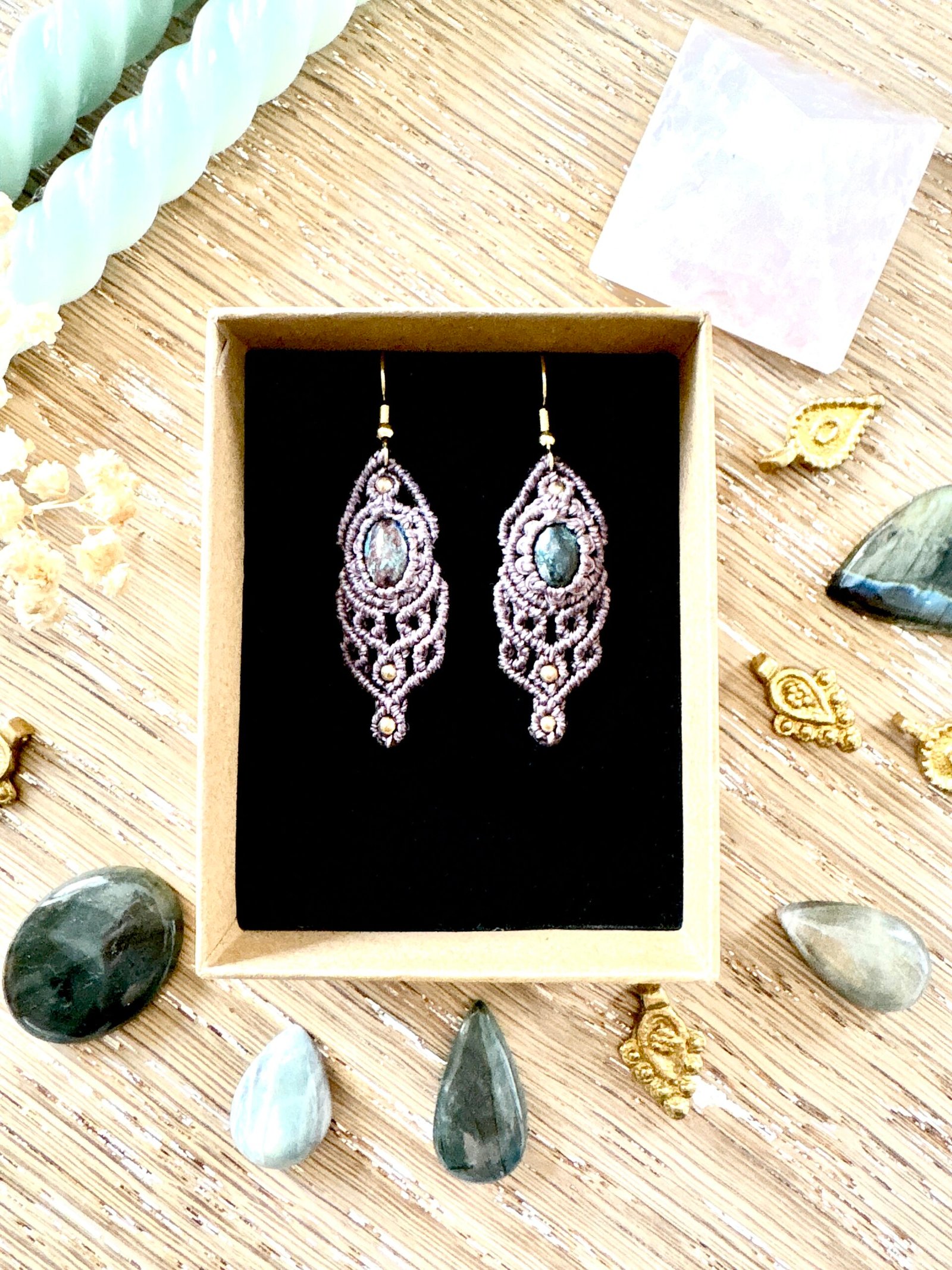 Ornées de cabochons d’amazonite, chaque paire est soigneusement réalisée à la main, alliant l’art du macramé à la beauté naturelle de l’amazonite, connue pour ses particularités apaisantes.