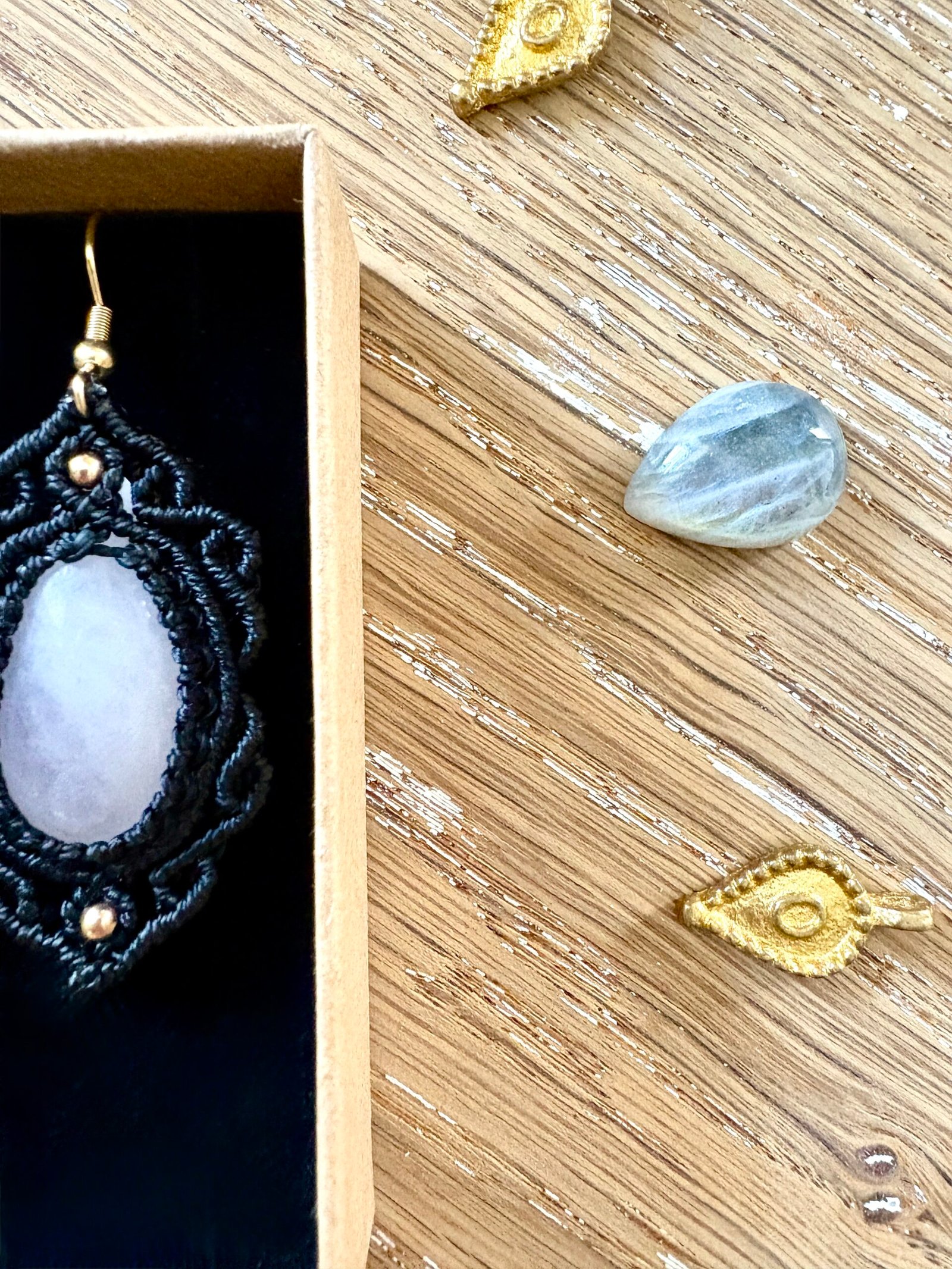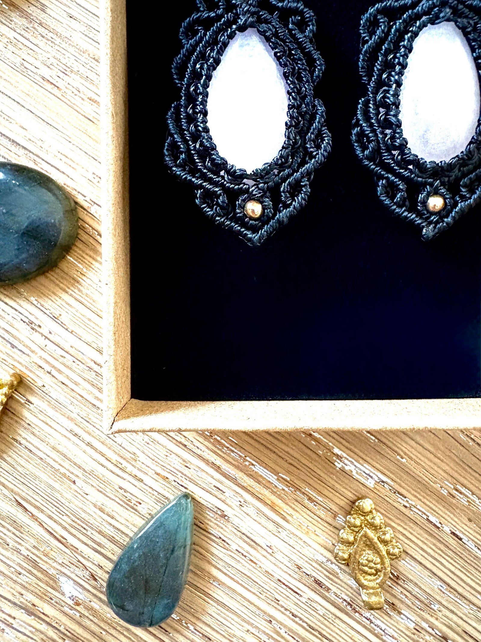 Fil ciré linhasita de couleur noir, perles laiton et pendants en acier doré inoxydable.