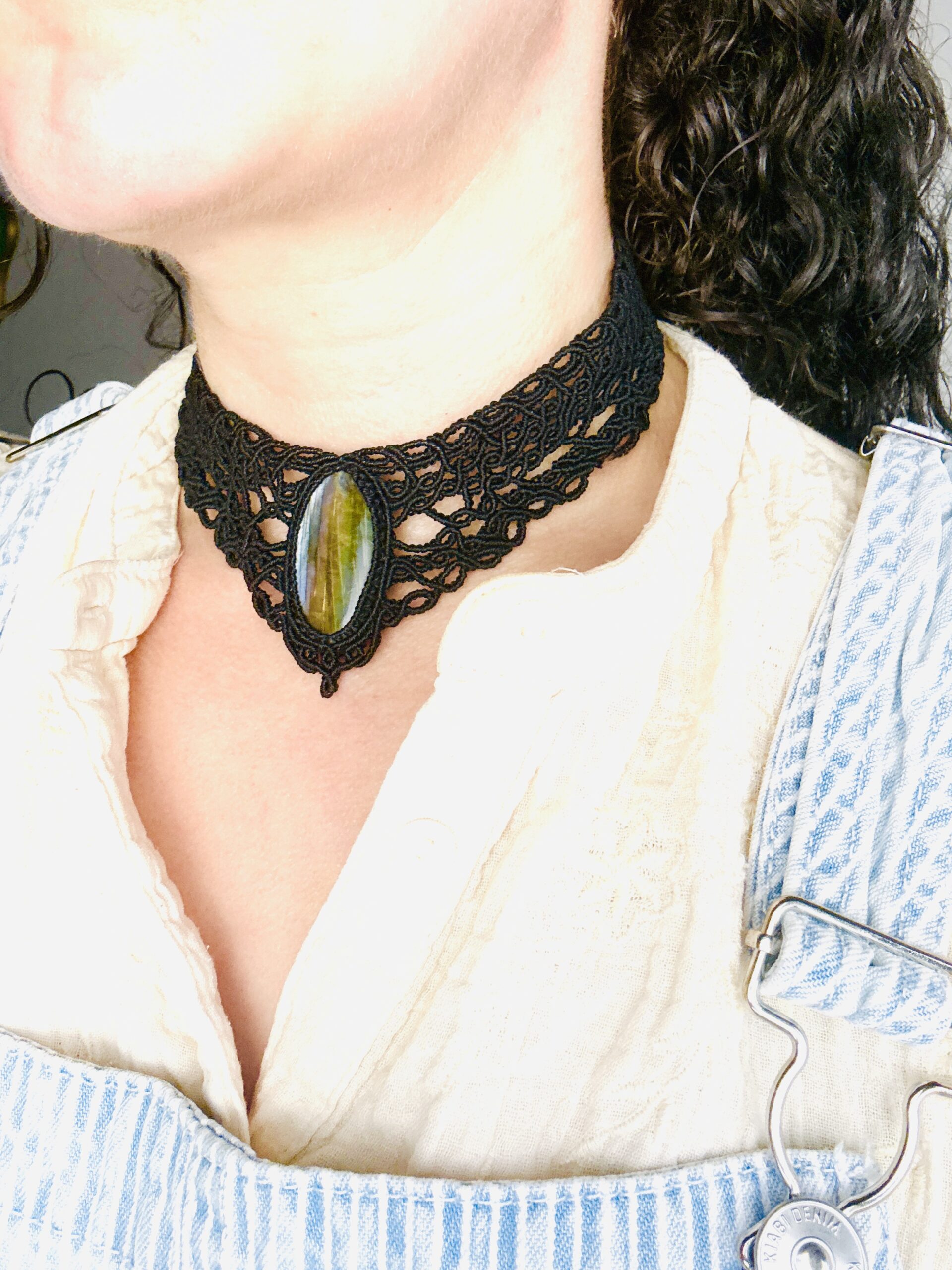 Ornée d’une somptueuse labradorite , ce chocker est soigneusement réalisé à la main, alliant l’art du micro macramé à la beauté naturelle de la labradorite, connue pour son rôle de bouclier contre les énergies négatives.