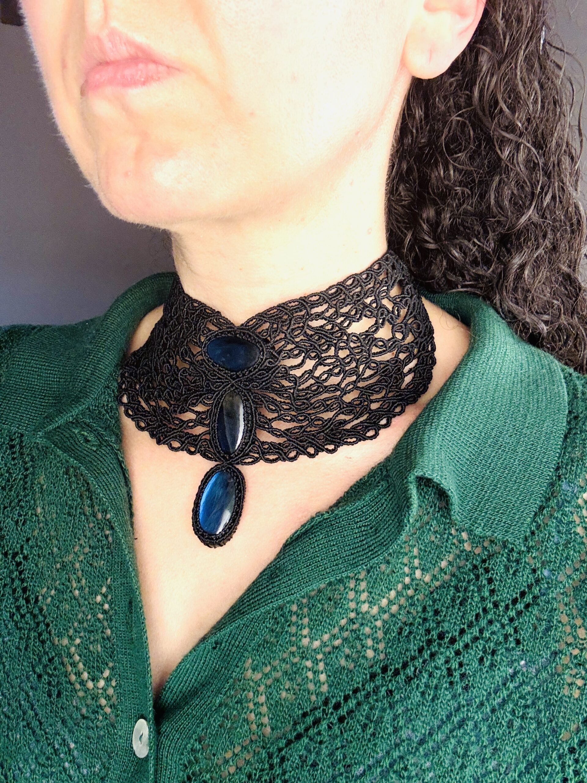 Ornée de 3 somptueuses labradorites , ce plastron est soigneusement réalisé à la main, alliant l’art du micro macramé à la beauté naturelle de la labradorite, connue pour son rôle de bouclier contre les énergies négatives.