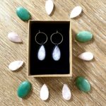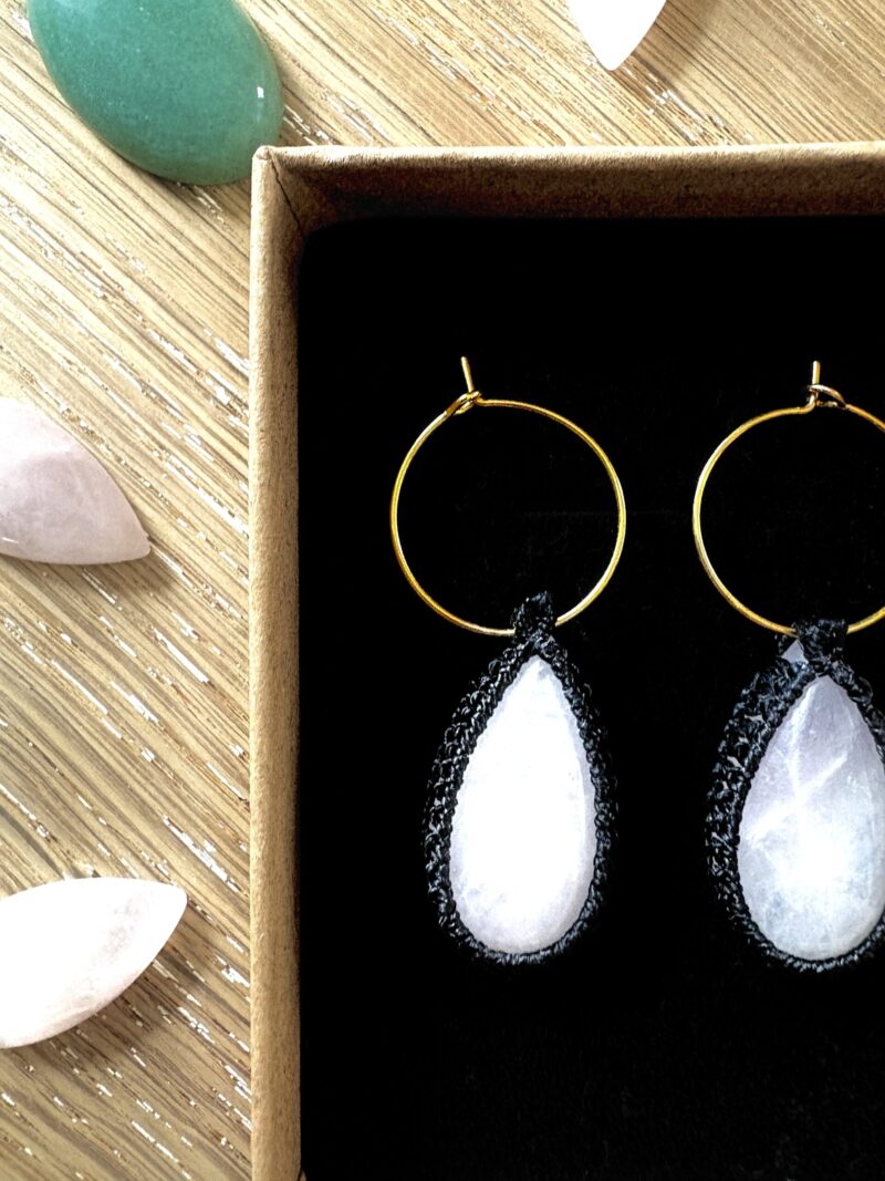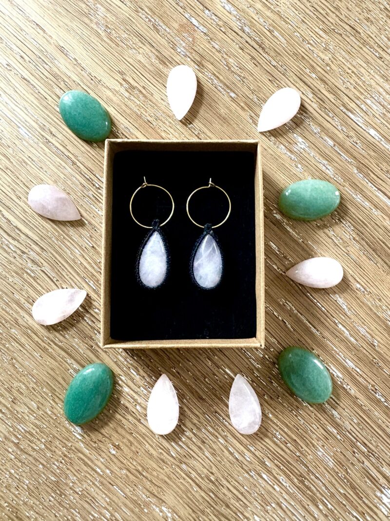 Orné de cabochons de quartz rose, ces boucles d’oreille soigneusement réalisées à la main, alliant l’art du micro macramé à la beauté naturelle du quartz rose, connue pour rééquilibrer les énergies du corps afin d’apaiser l’esprit et favoriser le bien-être.