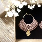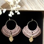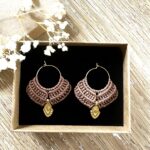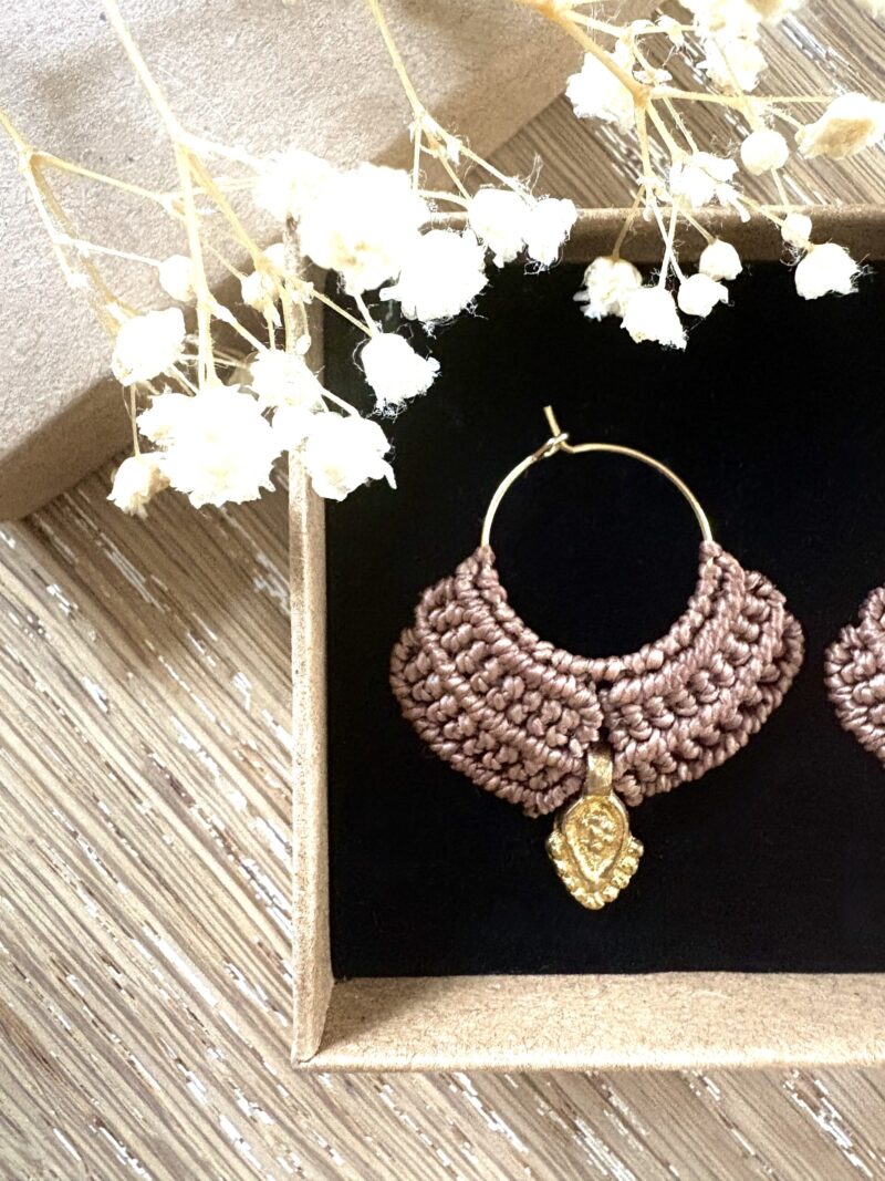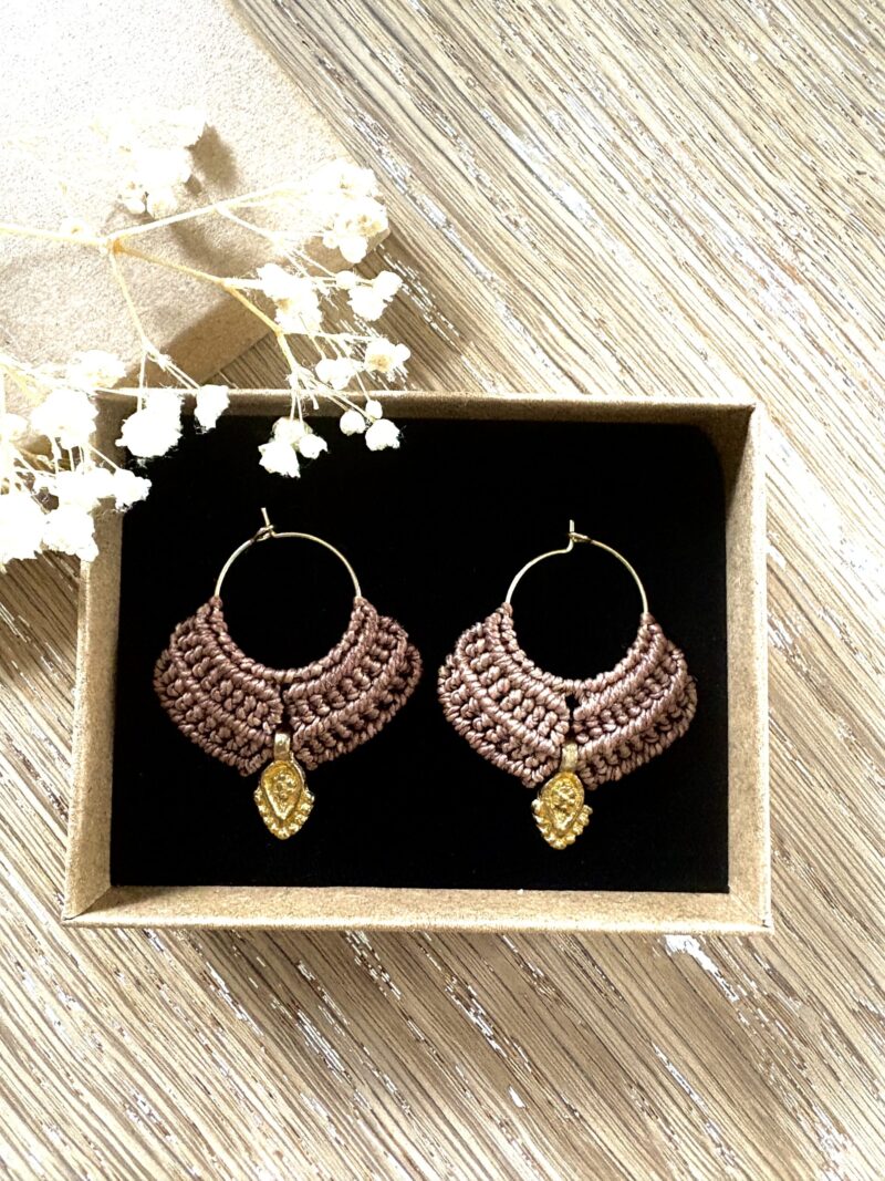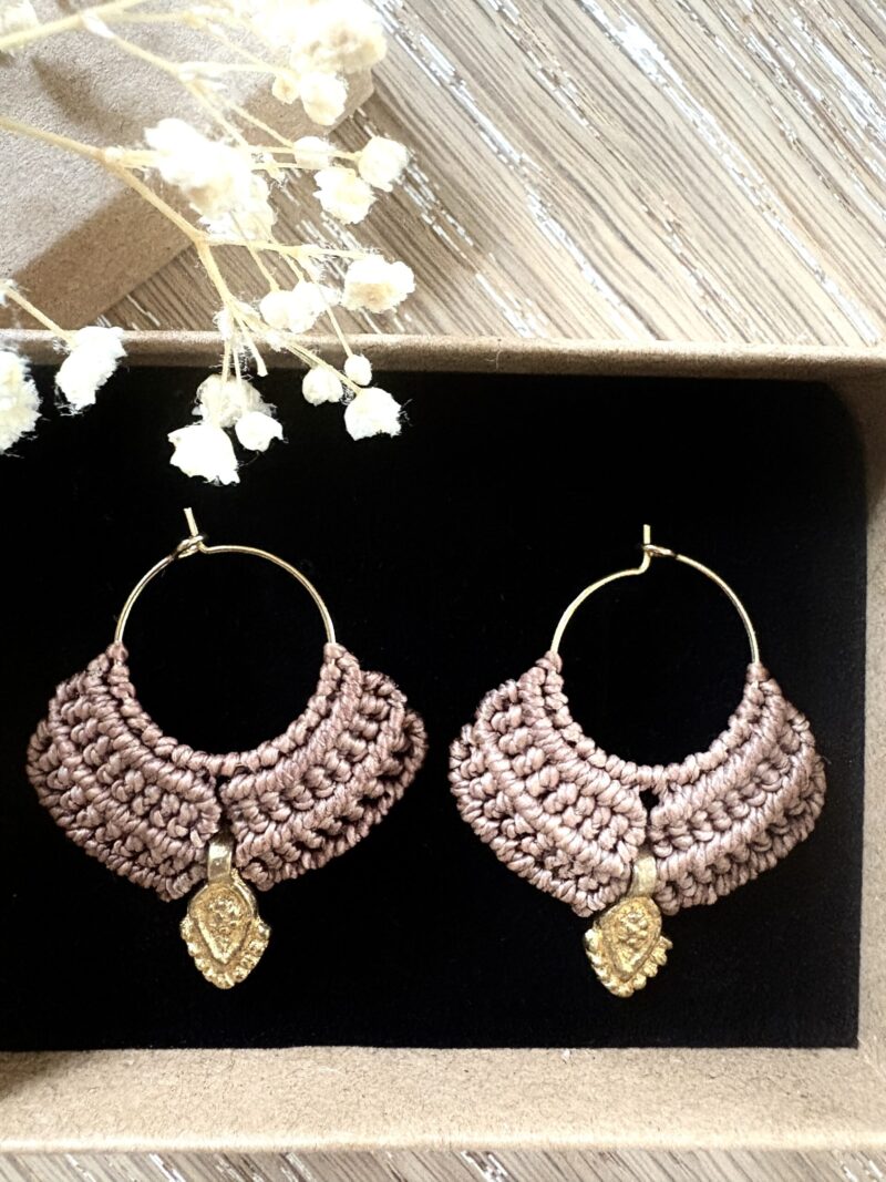 Créoles ethniques en micro macramé avec breloques indiennes en laiton, légères et raffinées. Un bijou artisanal unique au style bohème chic.