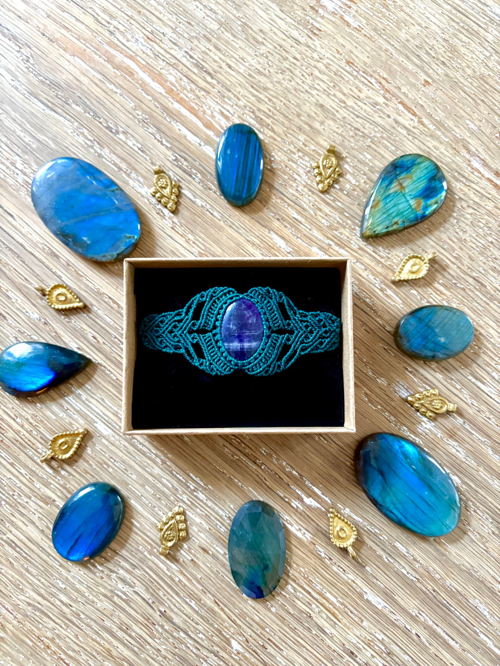 Orné d’un cabochon d’améthyste, chaque manchette est soigneusement réalisée à la main, alliant l’art du macramé à la beauté naturelle de l’oeil de tigre, connu pour éloigner les énergies négatives et créer un bouclier contre les influences indésirables. Cette manchette est montée sur un ravissant cabochon d’améthyste , accompagnée d’un délicat design arabesques.