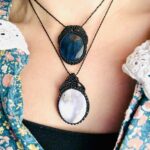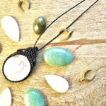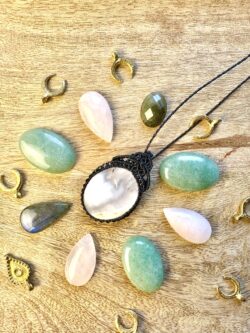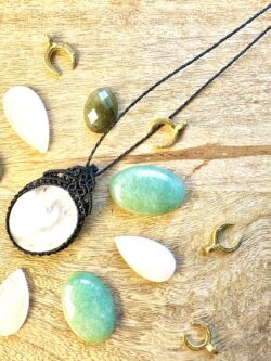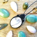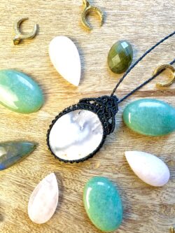 Ornée d’une somptueuse pierre de lune, ce médaillon est soigneusement réalisé à la main, alliant l’art du micro macramé à la beauté naturelle de la pierre de lune, connue pour calmer le mental.