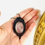 Orné d’un cabochon de quartz rose, ce médaillon est soigneusement réalisé à la main, alliant l’art du micro macramé à la beauté naturelle du quartz rose, connue pour rééquilibrer les énergies du corps afin d’apaiser l’esprit et favoriser le bien-être.