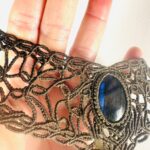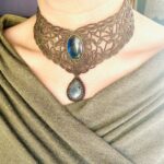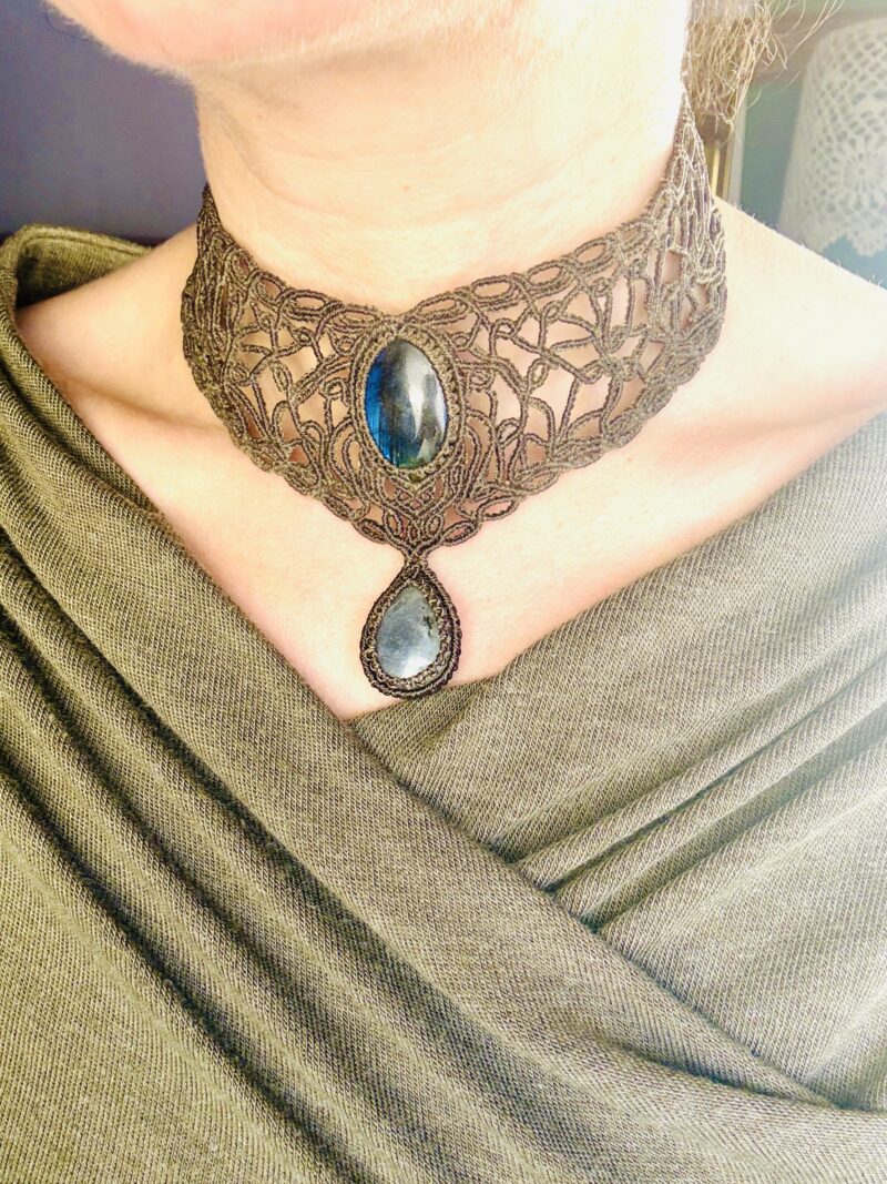 Ornée de somptueuses labradorites bleu et d’une labradorite grise en forme de goutte , ce bijou est soigneusement réalisé à la main, alliant l’art du micro macramé à la beauté naturelle de la labradorite, connue pour son rôle de bouclier contre les énergies négatives.