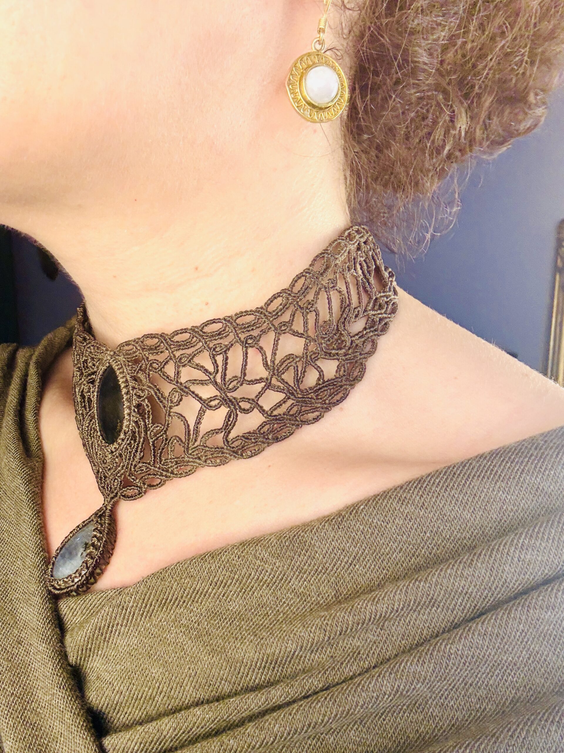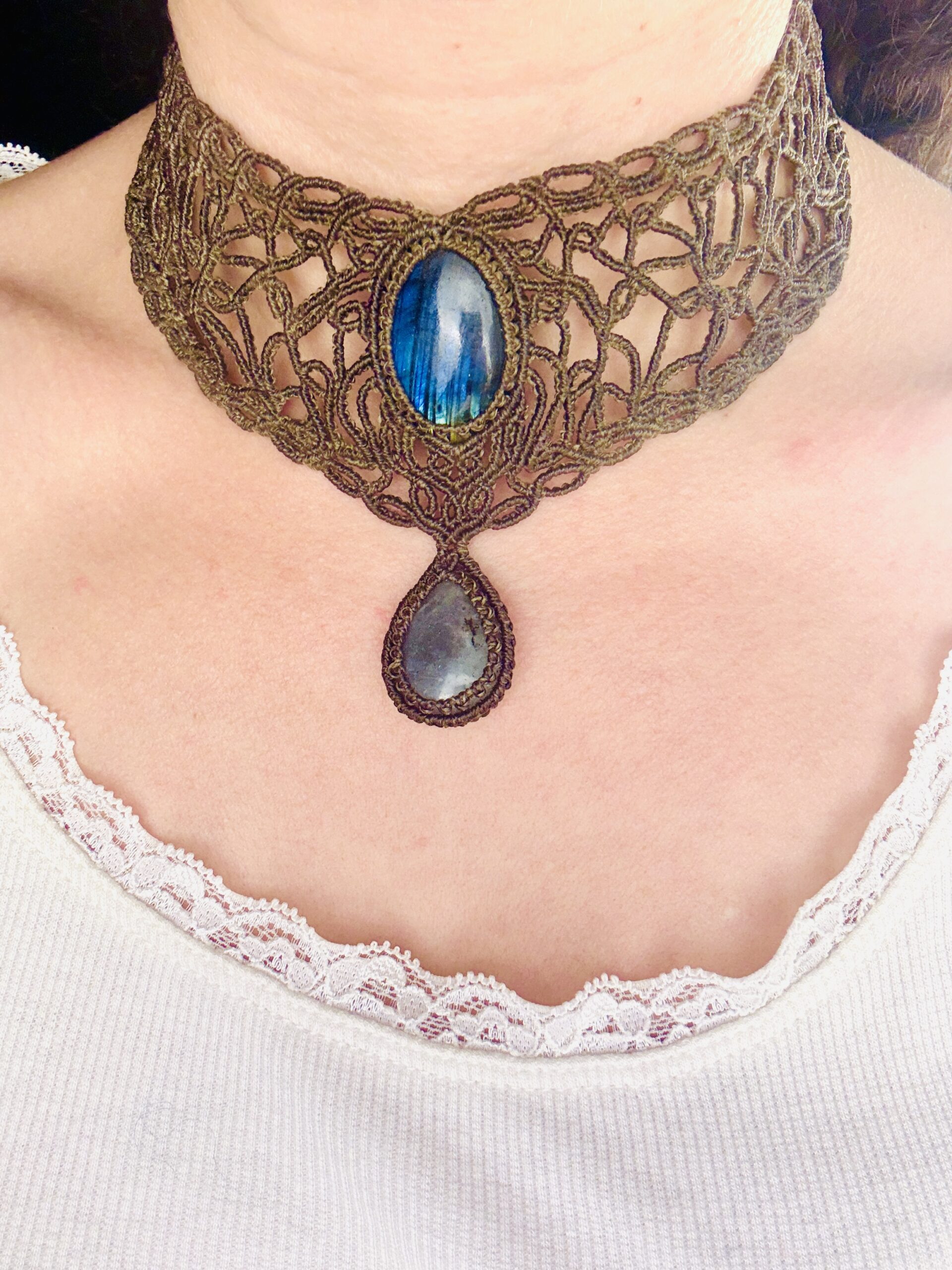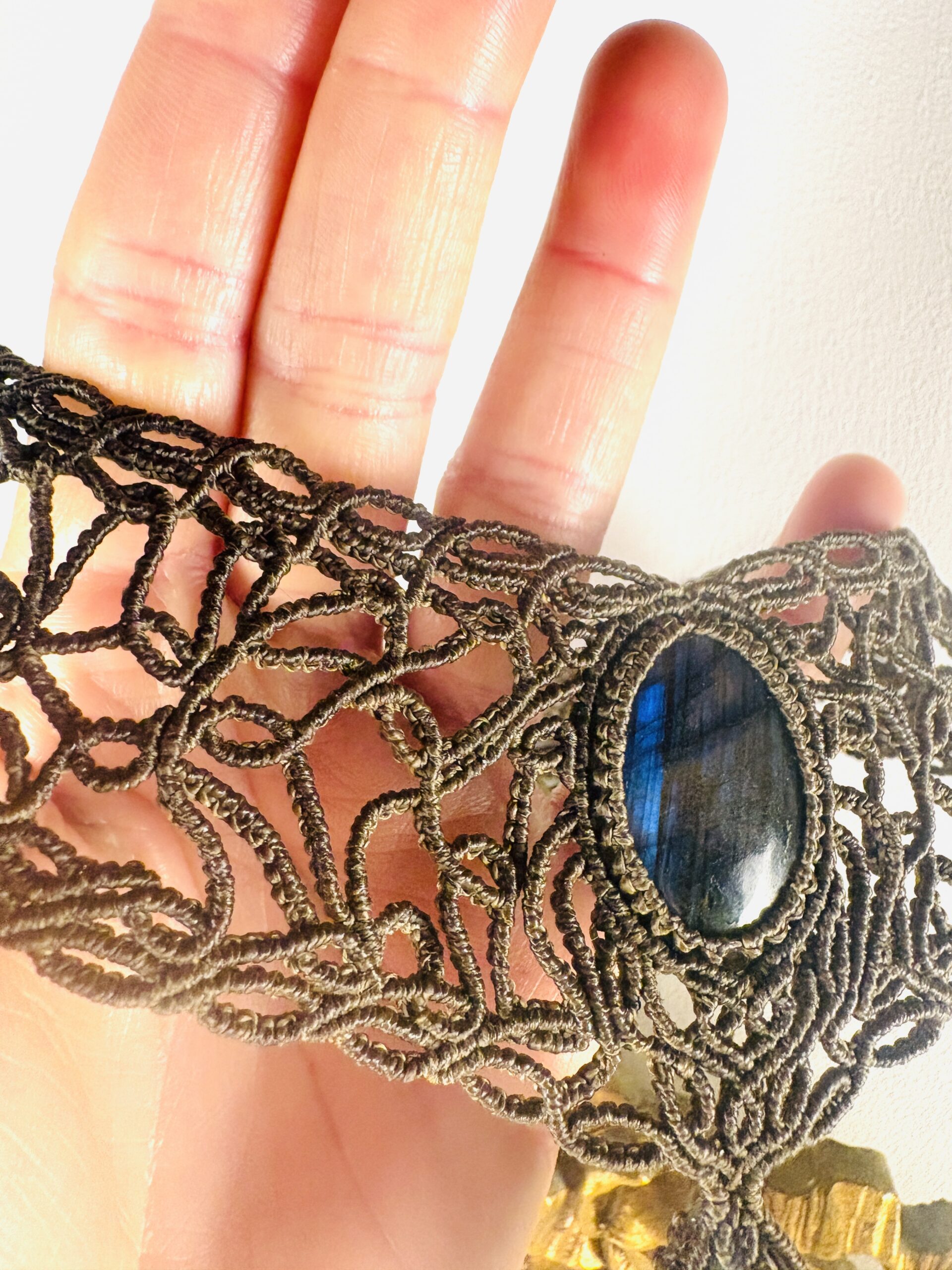 Ornée de somptueuses labradorites bleu et d’une labradorite grise en forme de goutte , ce bijou est soigneusement réalisé à la main, alliant l’art du micro macramé à la beauté naturelle de la labradorite, connue pour son rôle de bouclier contre les énergies négatives.