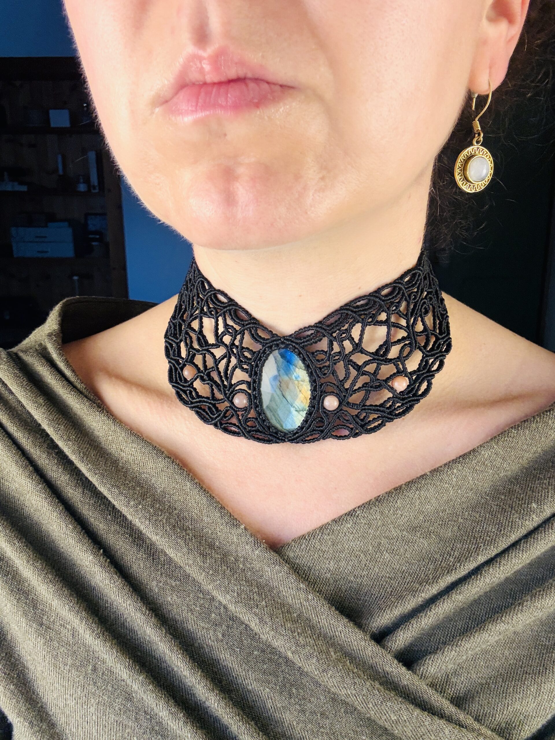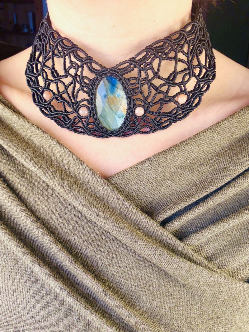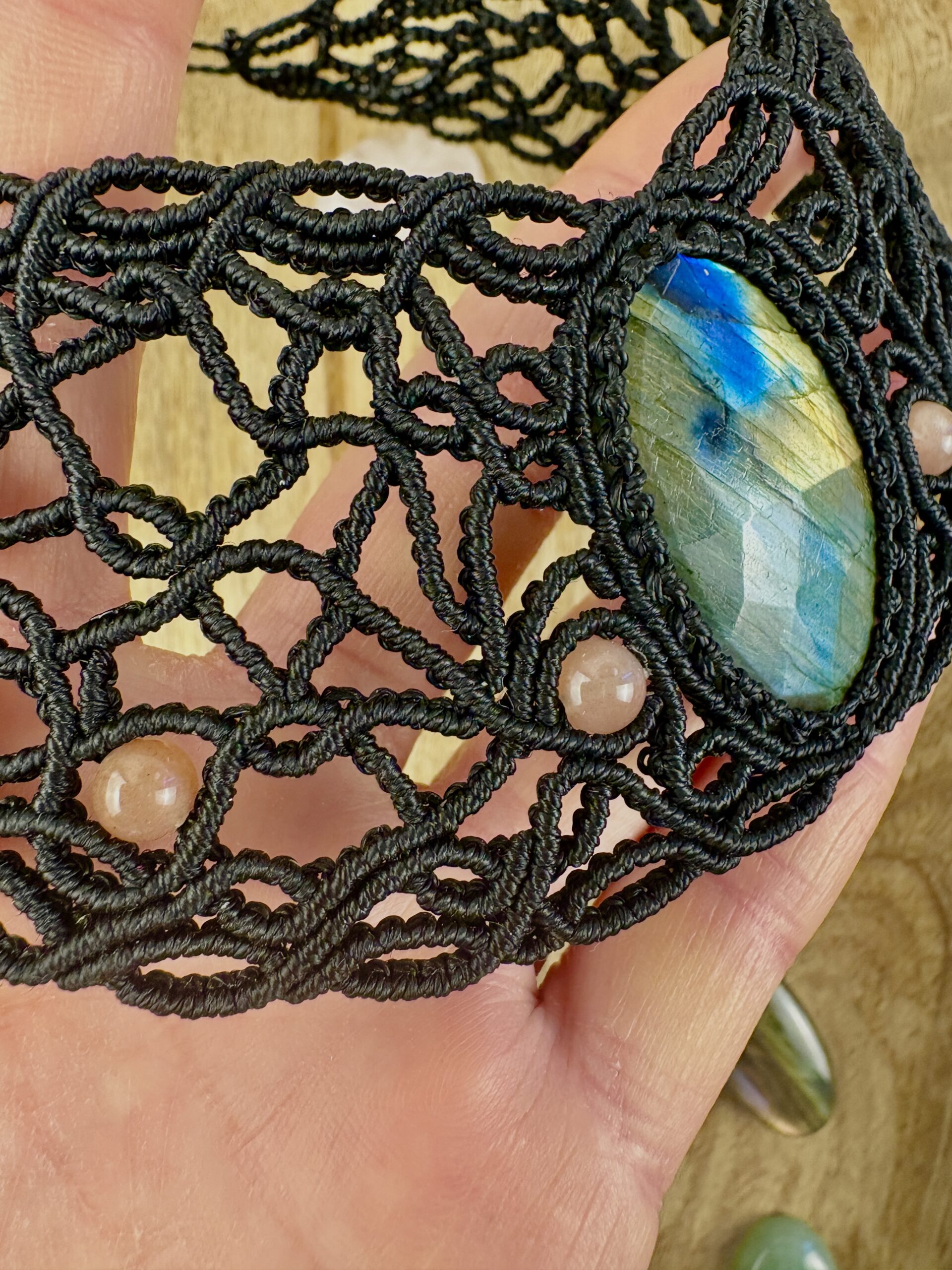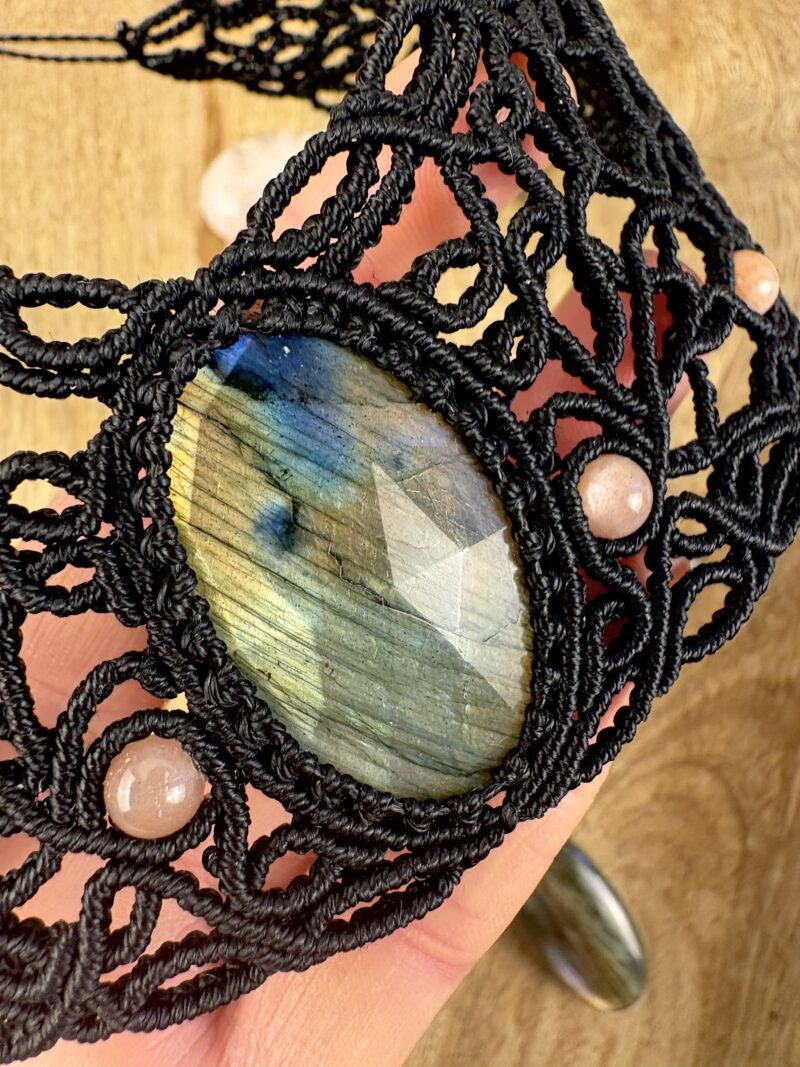 Ornée de somptueuse labradorite facettée , ce bijou est soigneusement réalisé à la main, alliant l’art du micro macramé à la beauté naturelle de la labradorite, connue pour son rôle de bouclier contre les énergies négatives.