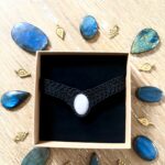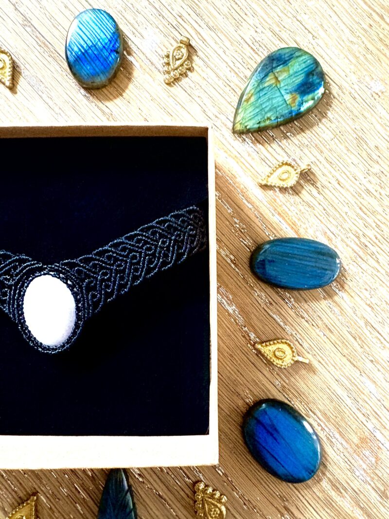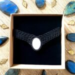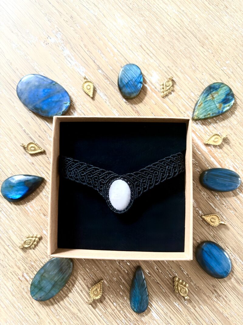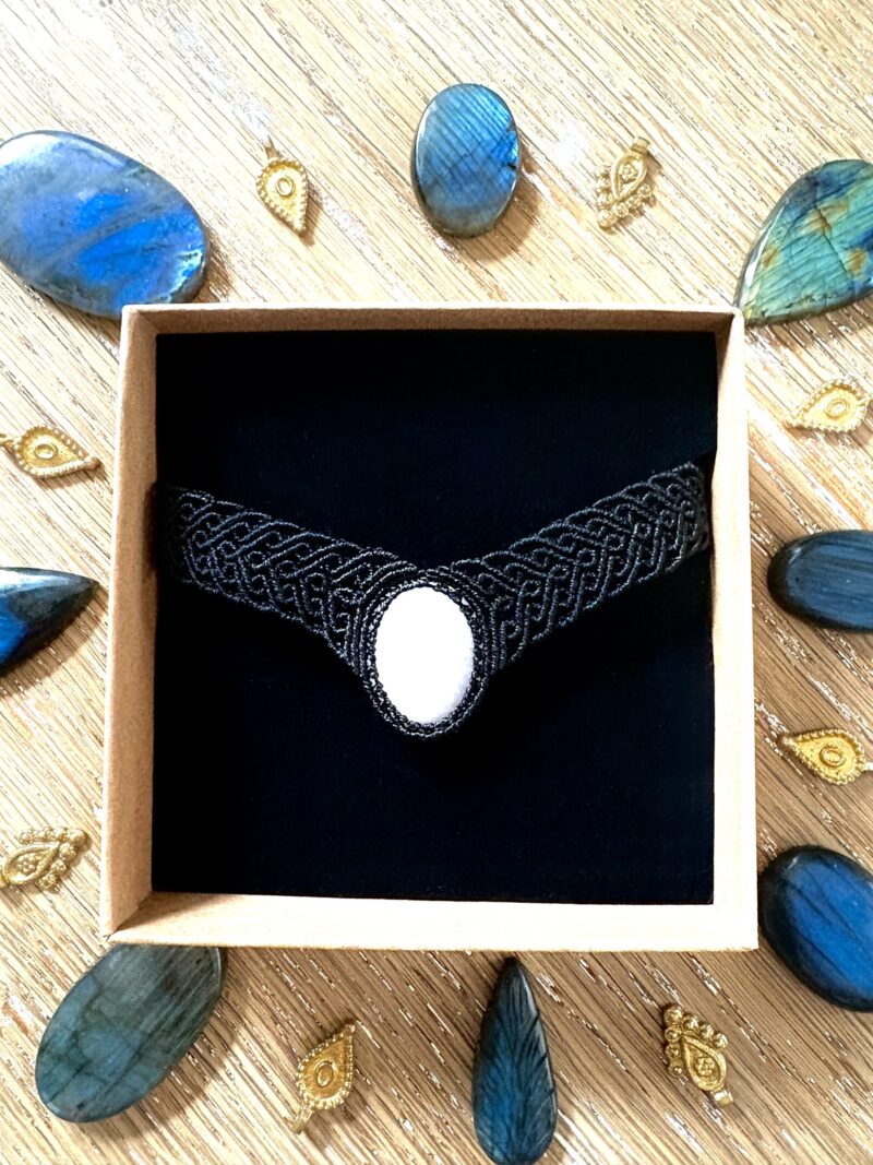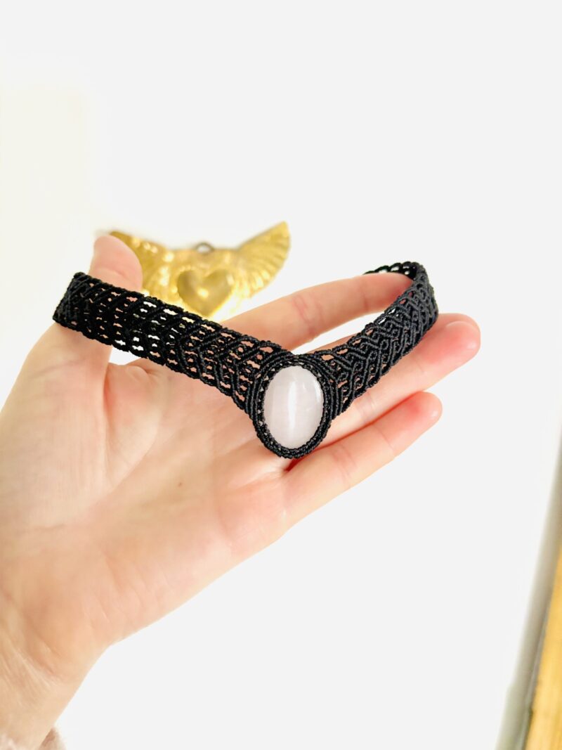 Orné d’un cabochon de quartz rose, ce ras de cou est soigneusement réalisé à la main, alliant l’art du micro macramé à la beauté naturelle du quartz rose, connue pour rééquilibrer les énergies du corps afin d’apaiser l’esprit et favoriser le bien-être.
