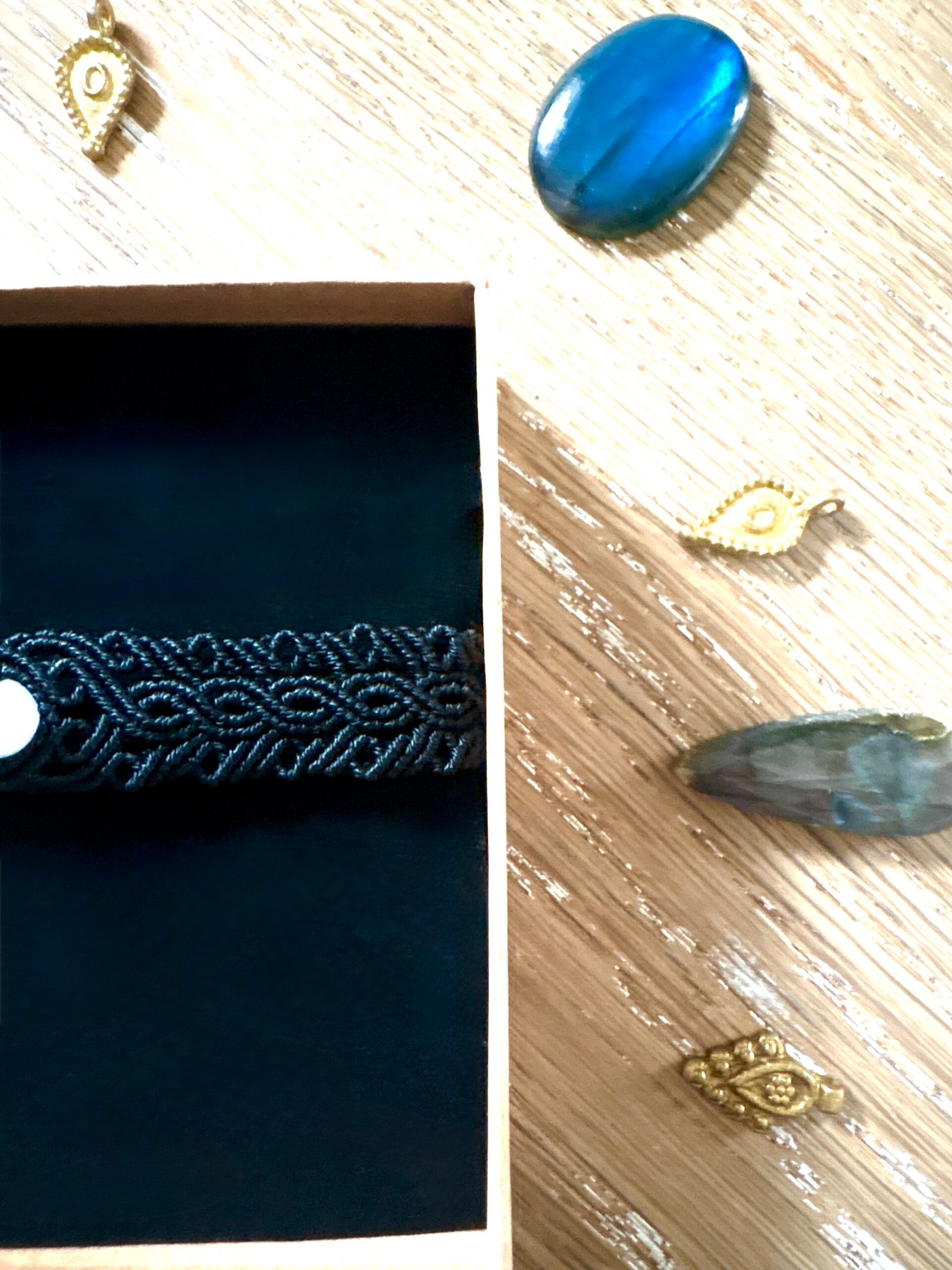 Orné d’une perle de quartz rose, ce ras de cou est soigneusement réalisé à la main, alliant l’art du micro macramé à la beauté naturelle du quartz rose, connue pour rééquilibrer les énergies du corps afin d’apaiser l’esprit et favoriser le bien-être.