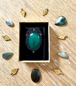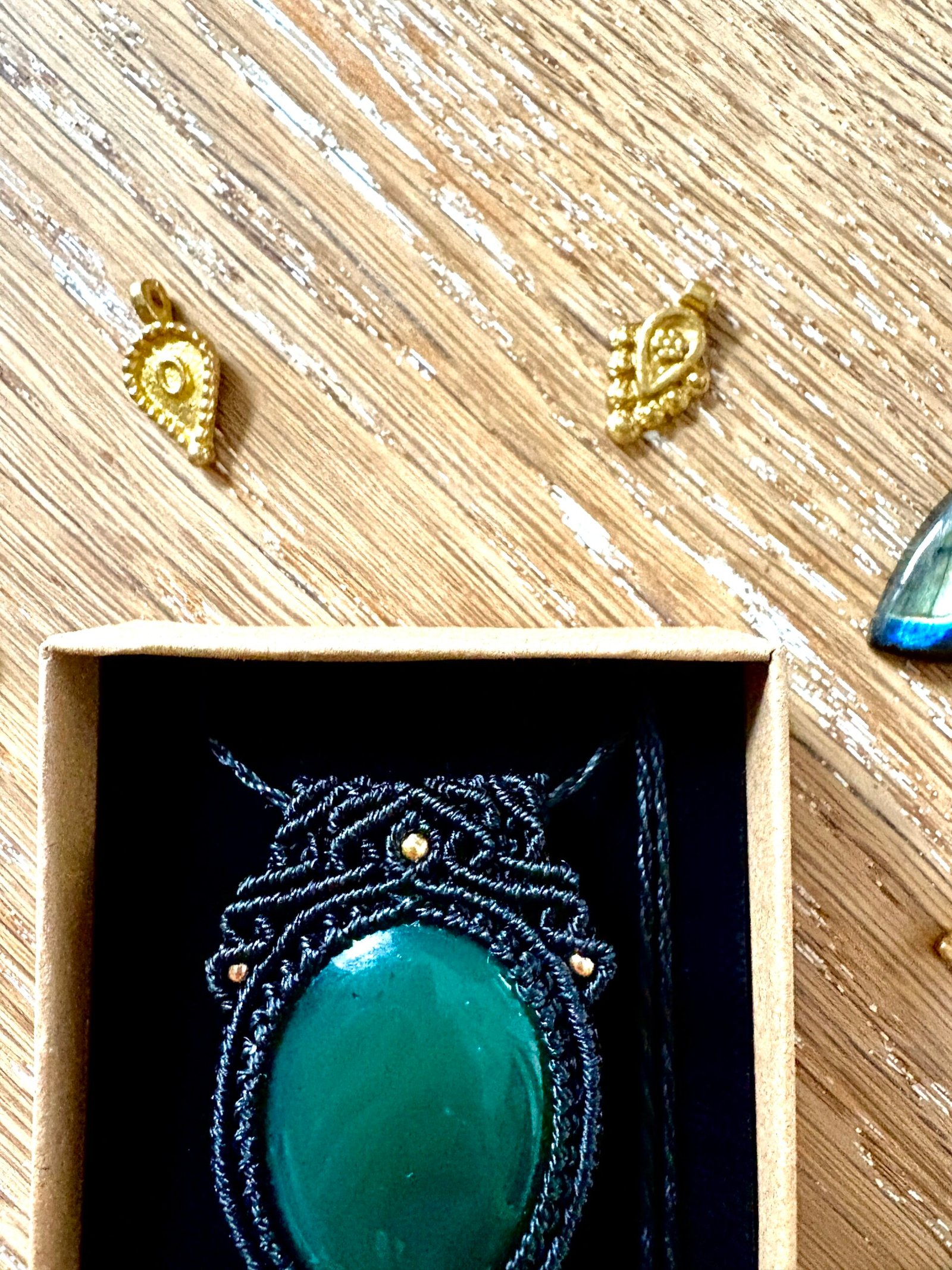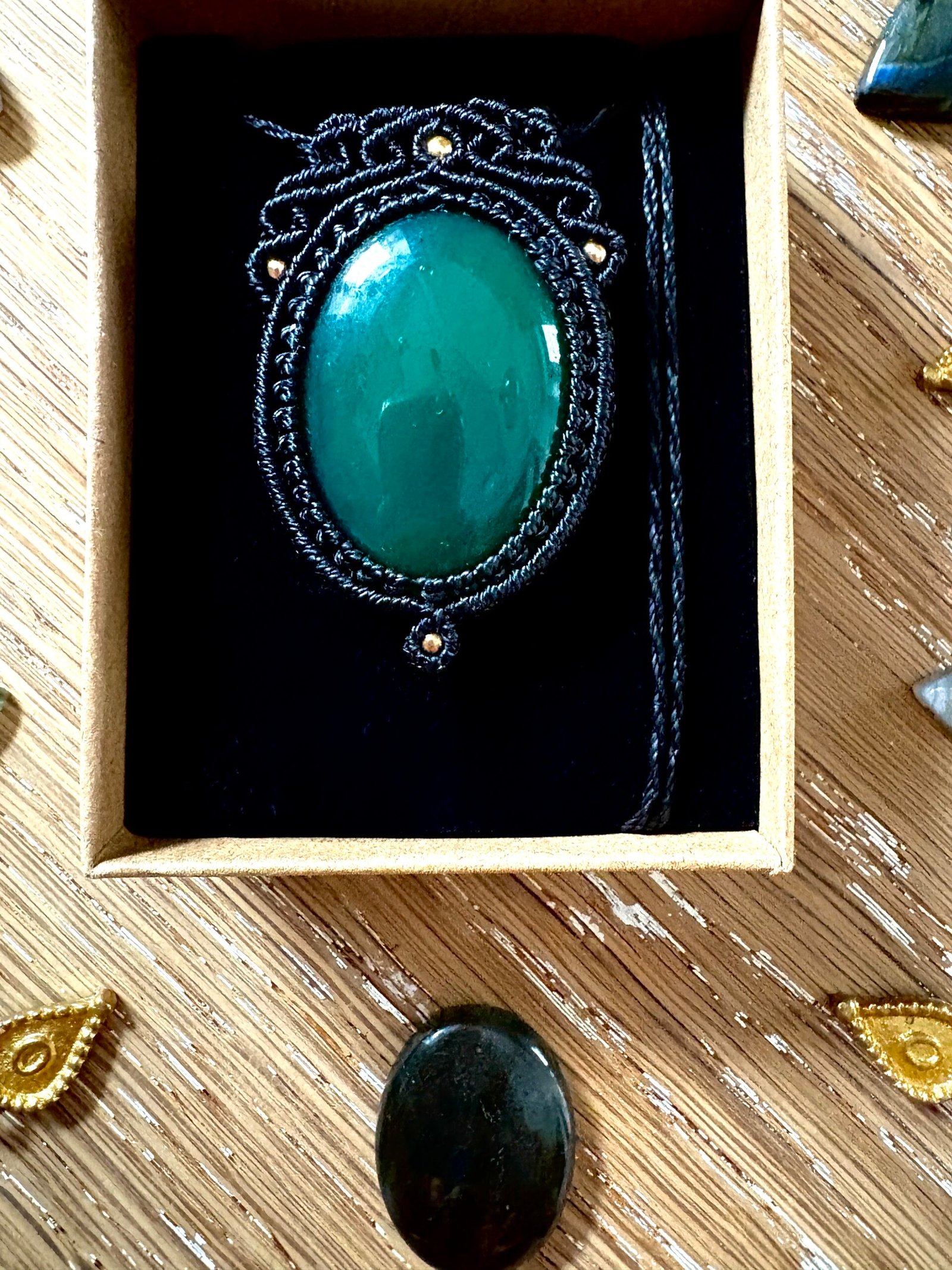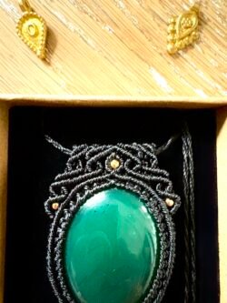 Ornée d’une somptueuse agate verte, ce talisman est soigneusement réalisé à la main, alliant l’art du micro macramé à la beauté naturelle de l’agate verte, connue pour dissiper l’anxiété et favoriser le bien-être.