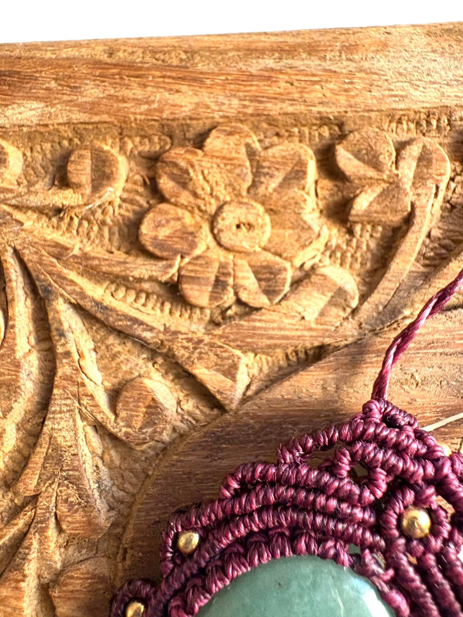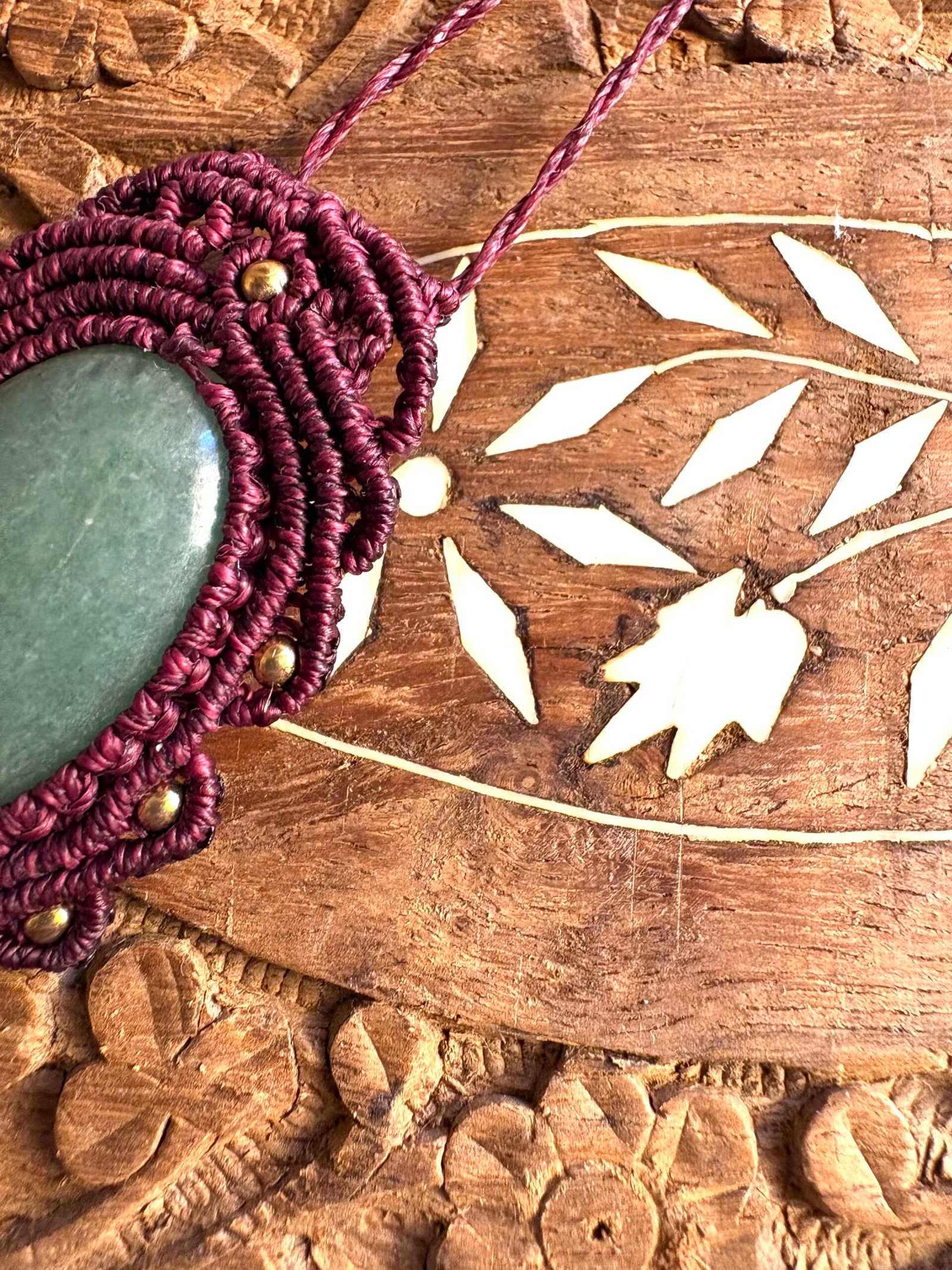 Talisman bordeaux en macramé avec aventurine verte, bijou artisanal unique aux vertus apaisantes et porte-bonheur. Élégant et idéal à offrir.