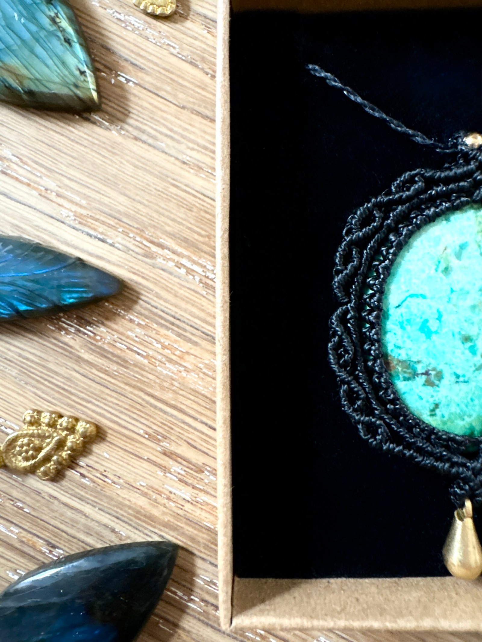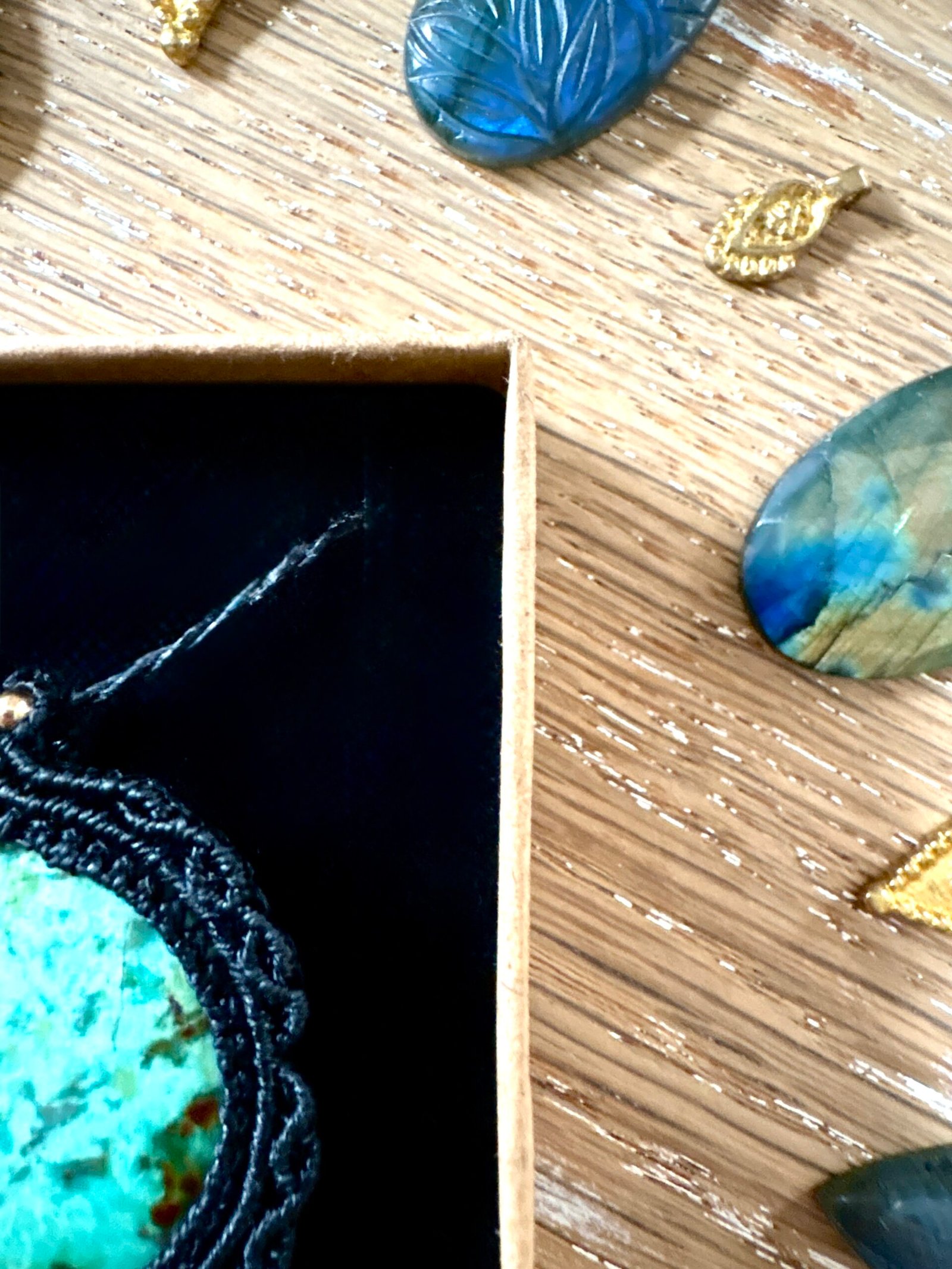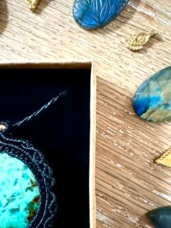 Ornée d’une somptueuse chrysocolle, ce talisman est soigneusement réalisé à la main, alliant l’art du macramé à la beauté naturelle de la chrysocolle, connue pour son rôle de neutralisateur des énergies négatives.
