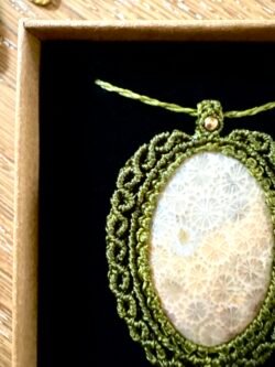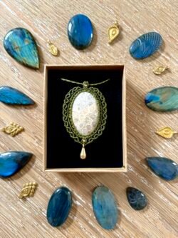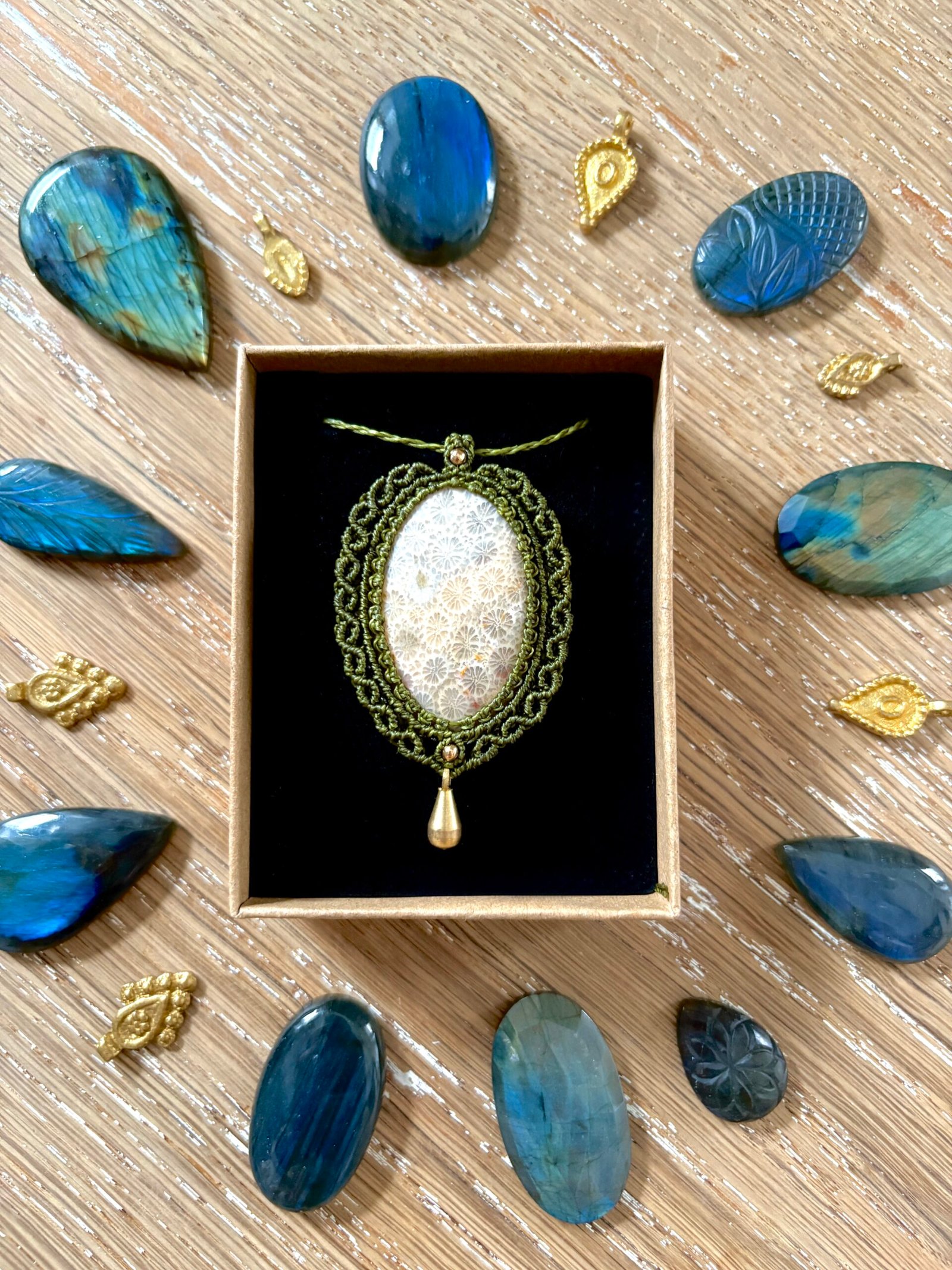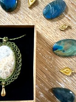 Ornée d’un somptueux corail fossile, ce talisman est soigneusement réalisé à la main, alliant l’art du macramé à la beauté naturelle du corail fossile, connue pour son rôle de pierre apaisante.