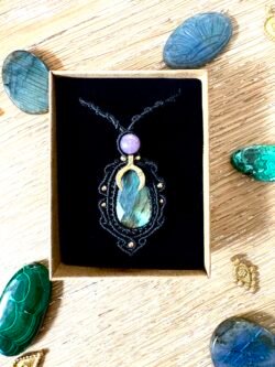Ornée d’une somptueuse labradorite facettée, ce talisman est soigneusement réalisé à la main, alliant l’art du macramé à la beauté naturelle de la labradorite, connue pour son rôle de bouclier contre les énergies négatives.Il se compose d’une labradorite facettée et d’une perle de lépidolite.