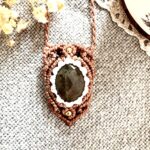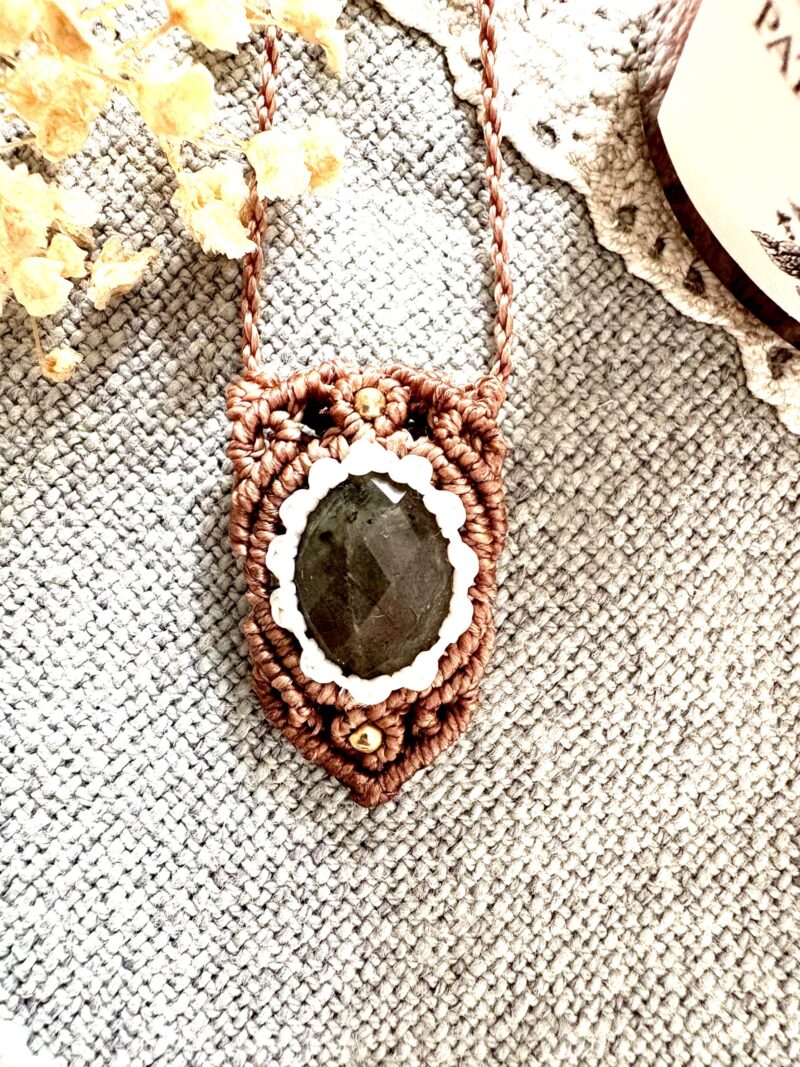 Ornée d’une somptueuse labradorite facettée. Ce pendentif est soigneusement réalisé à la main, alliant l’art du macramé à la beauté naturelle de la labradorite, connue pour son rôle de bouclier contre les énergies négatives.