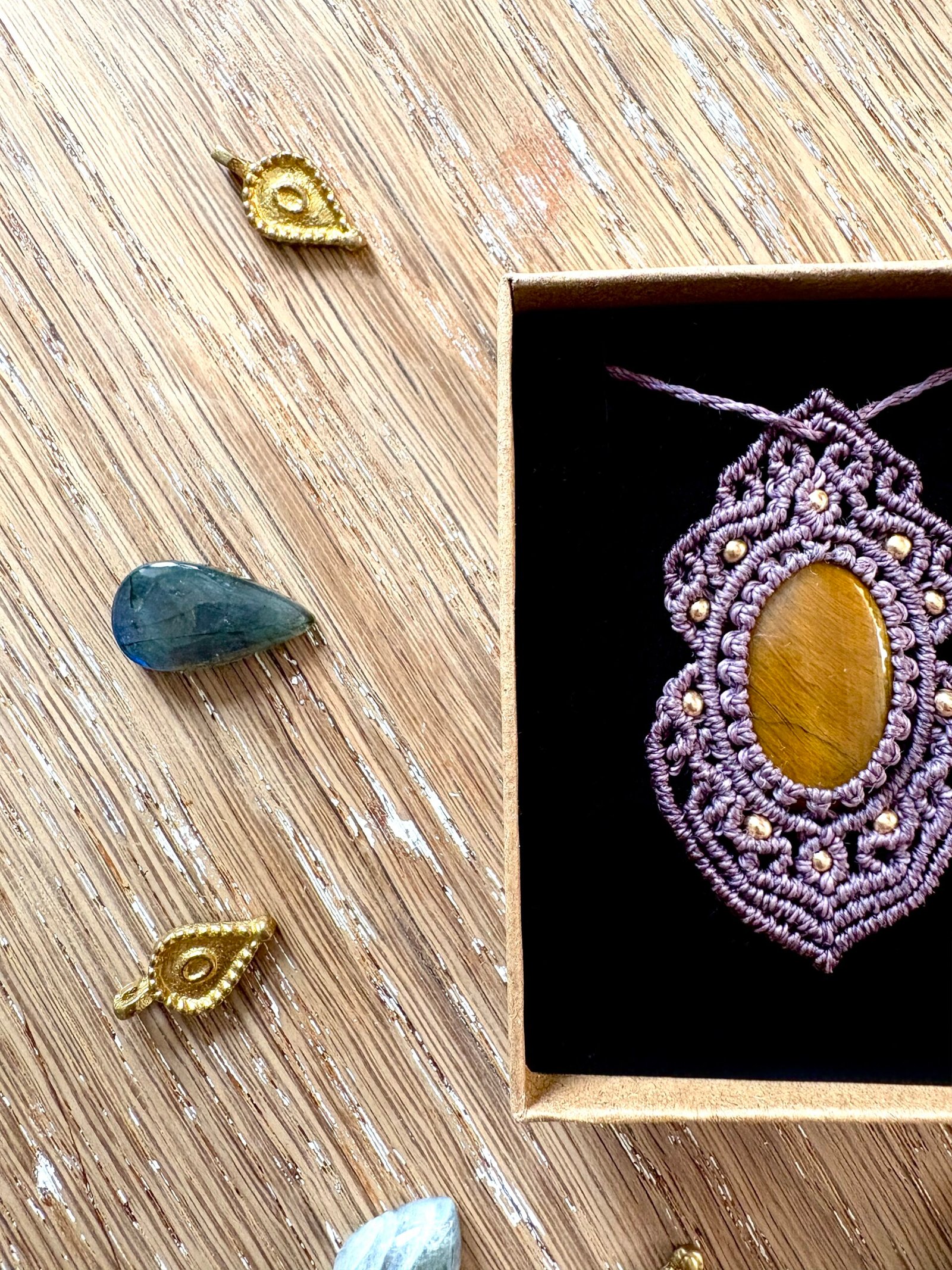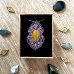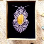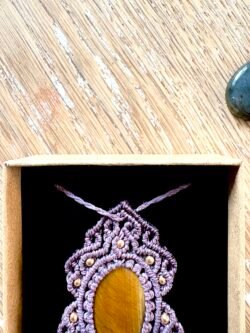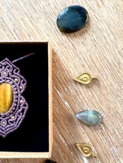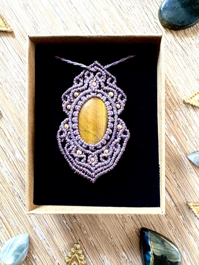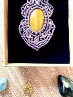 Orné d’un cabochon d’oeil de tigre, chaque talisman est soigneusement réalisé à la main, alliant l’art du macramé à la beauté naturelle de l’oeil de tigre, connu pour éloigner les énergies négatives et créer un bouclier contre les influences indésirables. Ce talisman est monté sur un ravissant cabochon d’oeil de tigre aux reflets dorés, accompagné d’un délicat design arabesques.