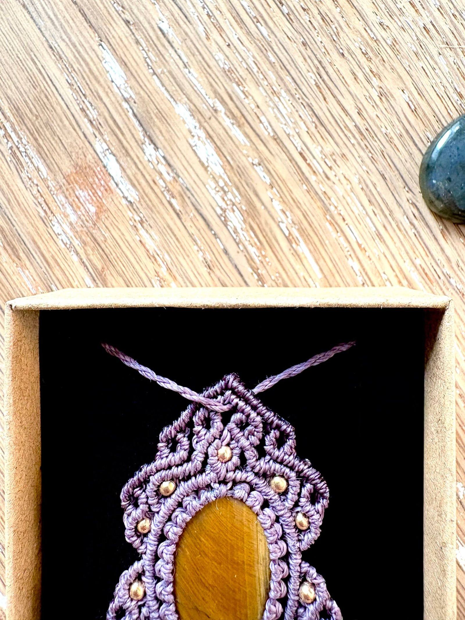 Fil ciré linhasita de couleur  violette, cabochon oeil de tigre, perles de laiton.